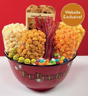Movie night, here you come! This sturdy, 10" enamelware bowl comes filled to capacity with all those traditional movie favorites, and then some: all-natural Butter, robust Cheese and secret-recipe Caramel corn, red licorice, Jelly Belly beans, chocolate chip cookies and creamy, foil-wrapped chocolates. And...action!